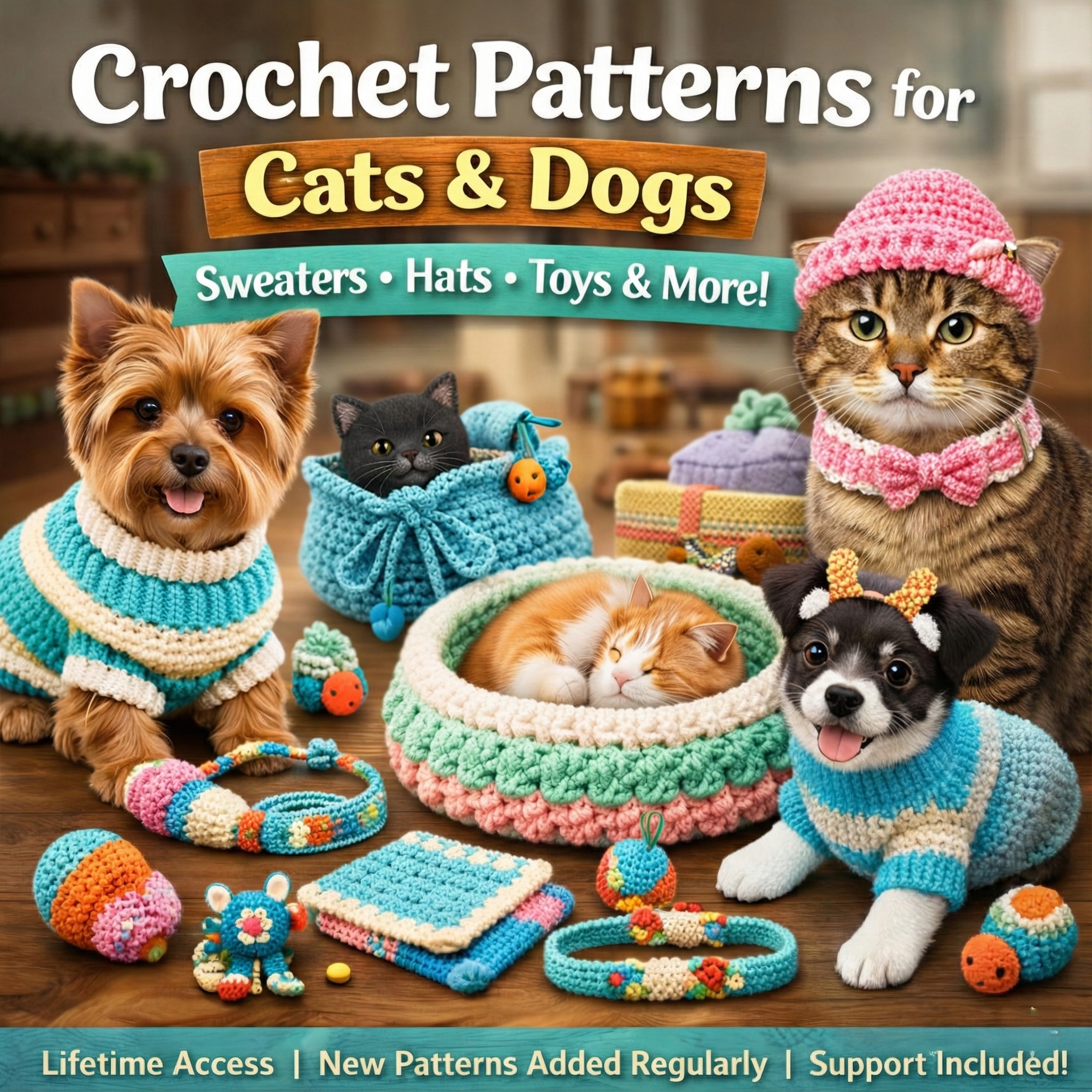 Step into a charming world of crochet designs created to bring warmth, beauty, and happiness into your pets’ lives.
